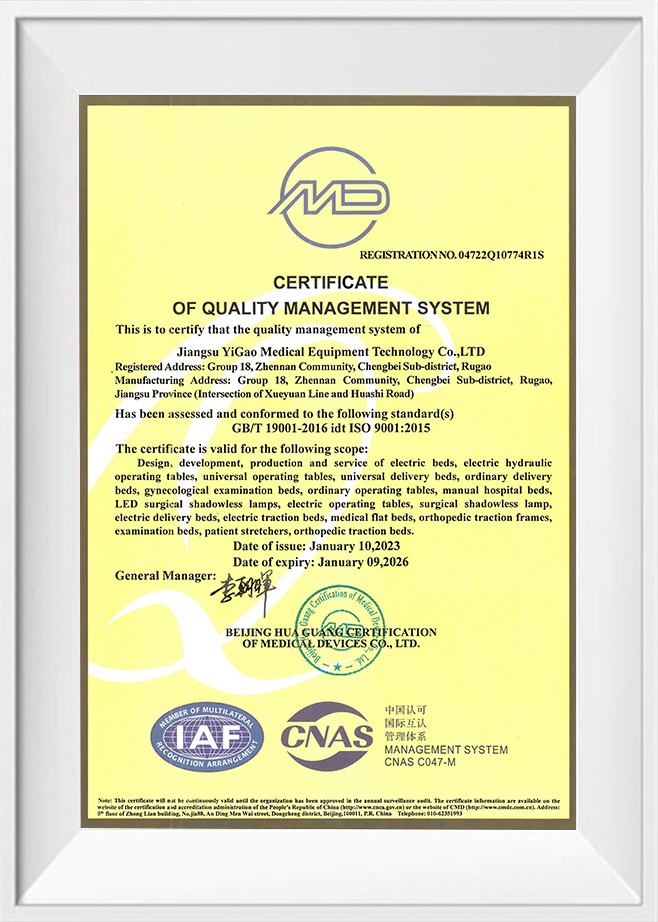 Als ein Unternehmen, das vergangen ist ISO 9001, ISO 13485, ISO 14001, ISO 45001 und anderen Managementsystemzertifizierungen betrachtet Jiangsu Yigao Medical Equipment Technology Co., Ltd. die Produktqualität als sein Lebenselixier. Unsere OP-Tische halten sich strikt daran CE-Normen Das bedeutet, dass sie nicht nur die Sicherheits-, Gesundheits- und Umweltanforderungen des europäischen Marktes erfüllen, sondern auch das international führende Niveau in Produktdesign und -herstellung repräsentieren.